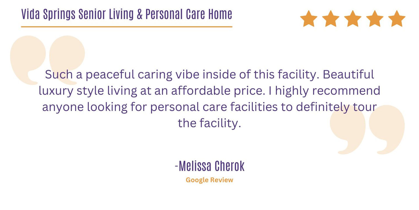 Vida Springs Senior Living and Personal Care Home is a small, family-owned company founded in 2023. “Vida” means dearly beloved, a name that embodies a profound sense of duty in ensuring that we remain committed to upholding our solemn oath of providing the best care for your loved ones at all times, without compromise.