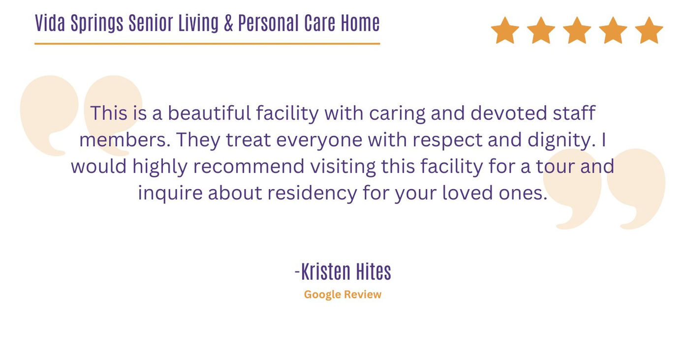 Vida Springs Senior Living and Personal Care Home is a small, family-owned company founded in 2023. “Vida” means dearly beloved, a name that embodies a profound sense of duty in ensuring that we remain committed to upholding our solemn oath of providing the best care for your loved ones at all times, without compromise.