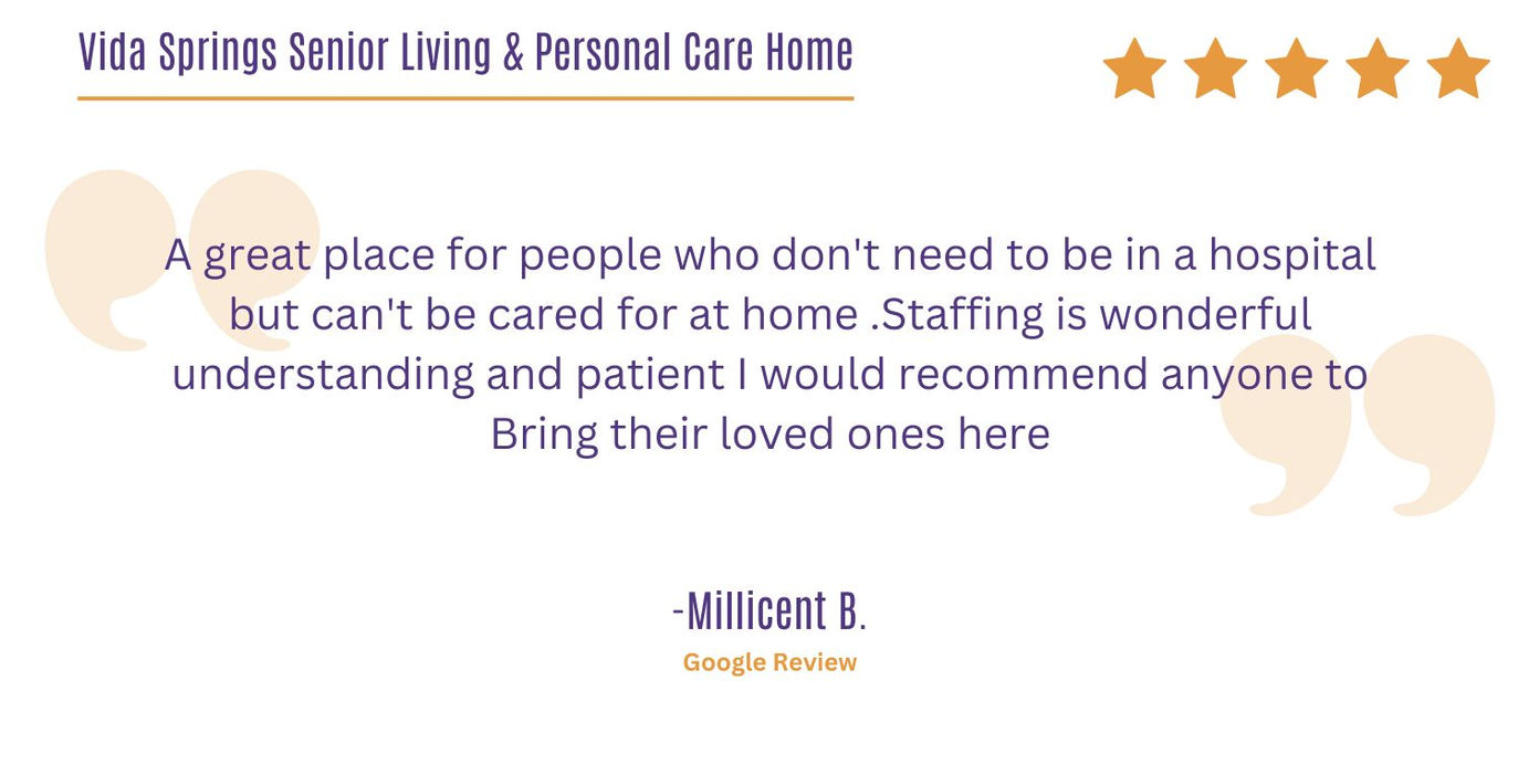 At Vida Springs Senior Living and Personal Care Home, our mission is deeply rooted in the belief that every individual deserves to live with dignity, respect, and joy. We are dedicated to providing exceptional care that goes beyond mere assistance – it is about fostering genuine connections, nurturing hearts, and enriching lives. Our commitment is to create a warm, welcoming environment where residents feel cherished, supported, and truly at home. With compassion as our compass, we strive to make each day meaningful, memorable, and filled with moments of love, laughter, and comfort. Together, we embark on a journey of compassion, purpose, and unwavering dedication, because at Vida Springs, caring is not just what we do – it’s who we are.